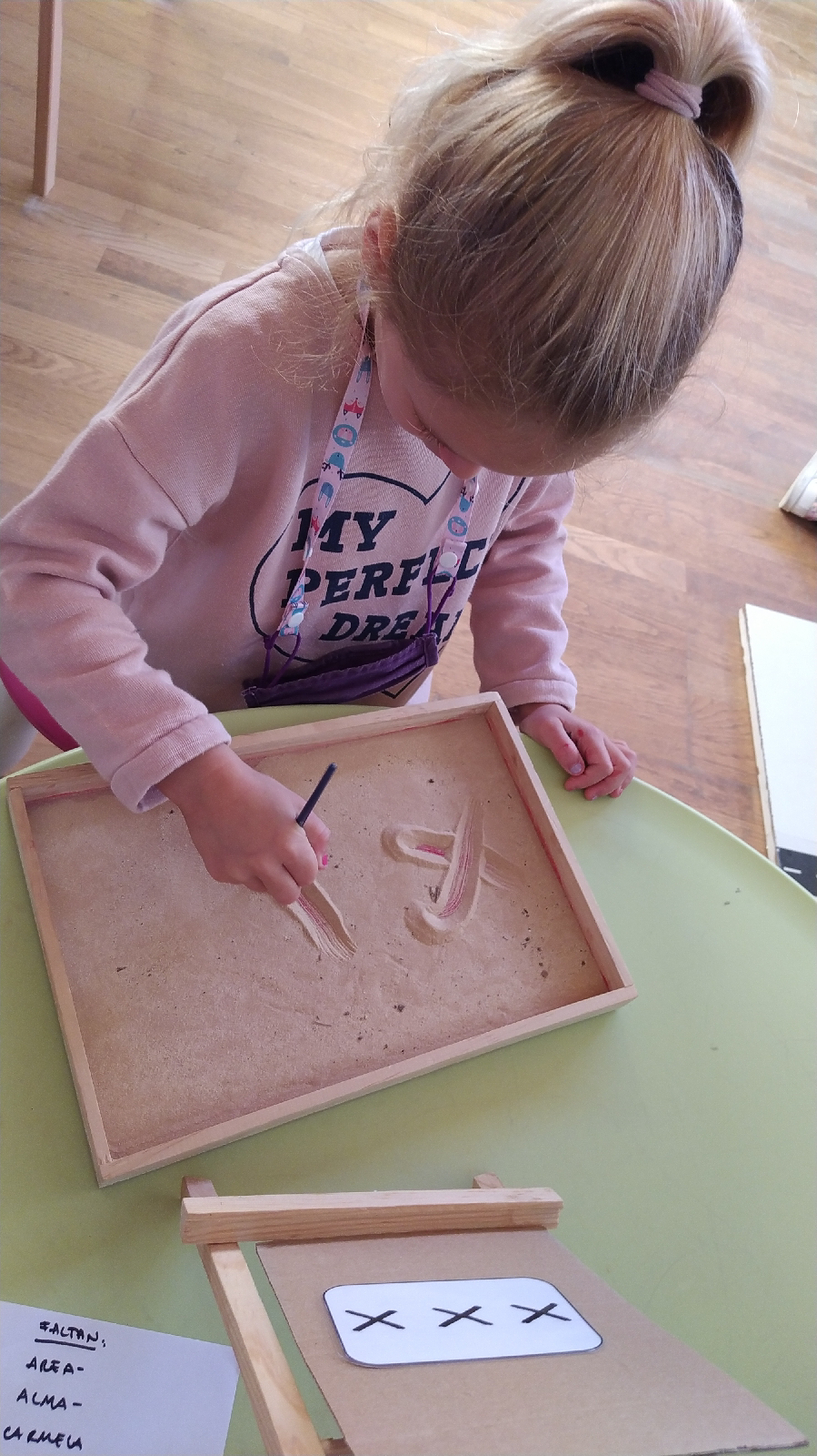 Na pedagoxía Montessori consideran que un dos pasos previos á mesma é practicar diferentes trazos e formas na bandexa de area.
